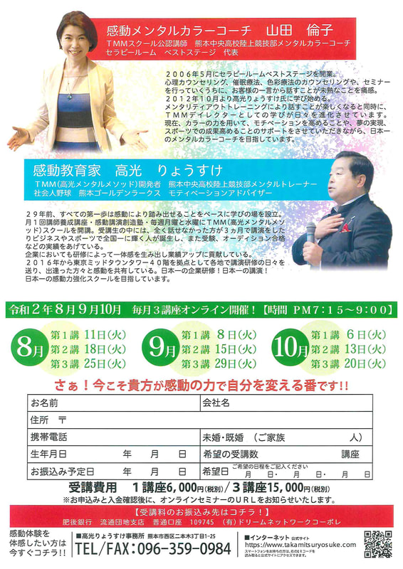 | ◆令和2年8月9月10月 毎月3講座オンライン開催! 【時間 PM7:15〜9:00】8月 ・第1講 11日(火) ・第2講 18日(火) ・第3講 25日(火) ※8月の応募は締め切りました。9月 ・第1講 8日(火) ・第2講 15日(火) ・第3講 29日(火)10月 ・第1講 6日(火) ・第2講 13日(火) ・第3講 20日(火)さぁ!今こそ貴方が感動の力で自分を変える番です!!2020特別オンラインセミナー.pdfファイルのダウンロード |
