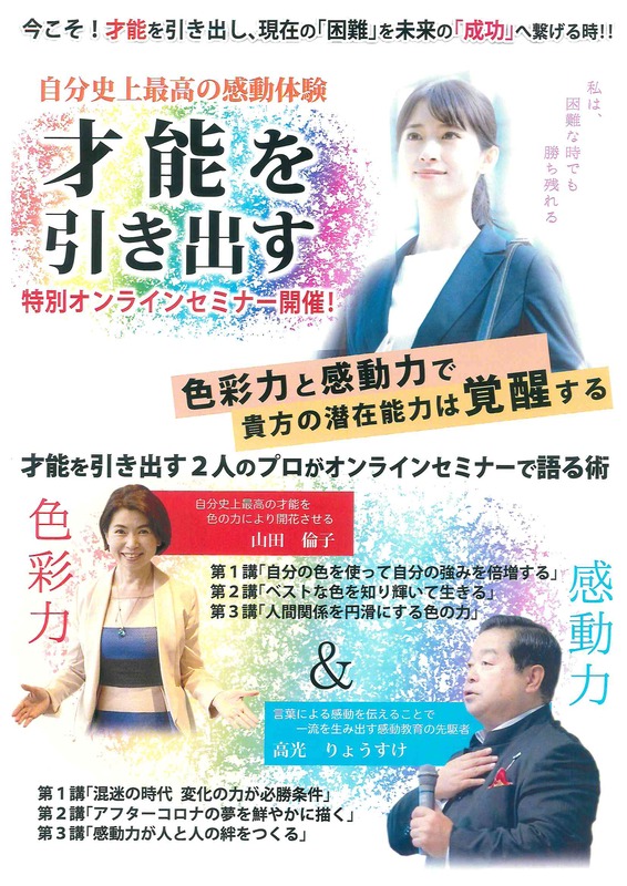 | ◆色彩力自分史上最高の才能を色の力により開花させる 山田 倫子第1講「自分の色を使って自分の強みを倍増する」 第2講「ベストな色を知り輝いて生きる」 第3講「人間関係を円滑にする色の力」◆感動力言葉による感動を伝えることで 一流を生み出す感動教育の先駆者 高光 りょうすけ第1講「混迷の時代 変化の力が必勝条件」 第2講「アフターコロナの夢を鮮やかに描く」 第3講「感動力が人と人の絆をつくる」 |