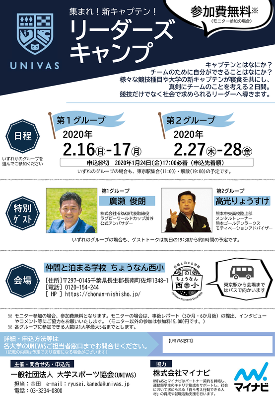 株式会社マイナビ(代表取締役社長:中川信行)と一般社団法人大学スポーツ協会(会長:鎌田薫)は、運動部の新キャプテンの学生を対象とした「リーダーズキャンプ」を千葉県長生郡長南町・ちょうなん西小にて初開催します。