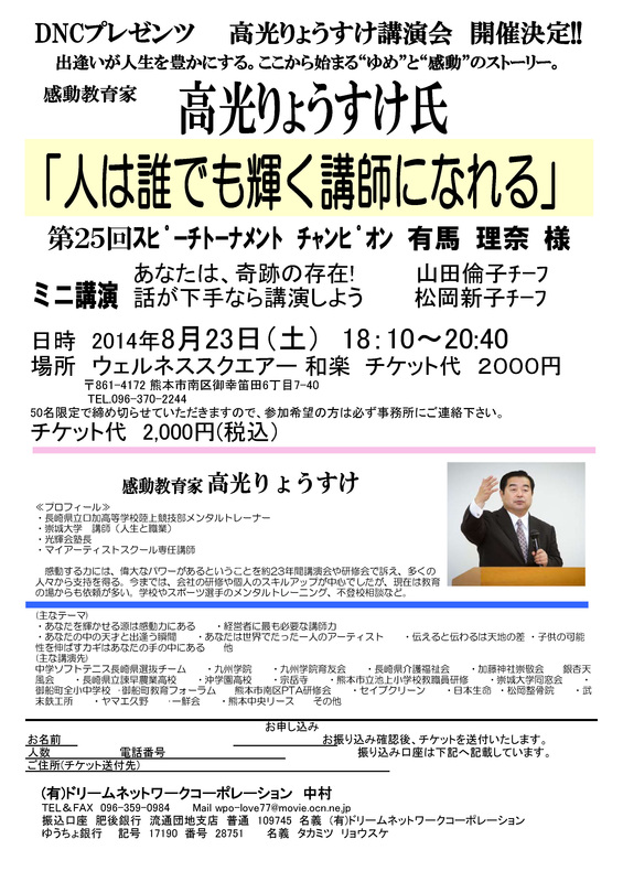 8月23日(土)高光りょうすけ講演会開催決定!!「人は誰でも輝く講師になれる」